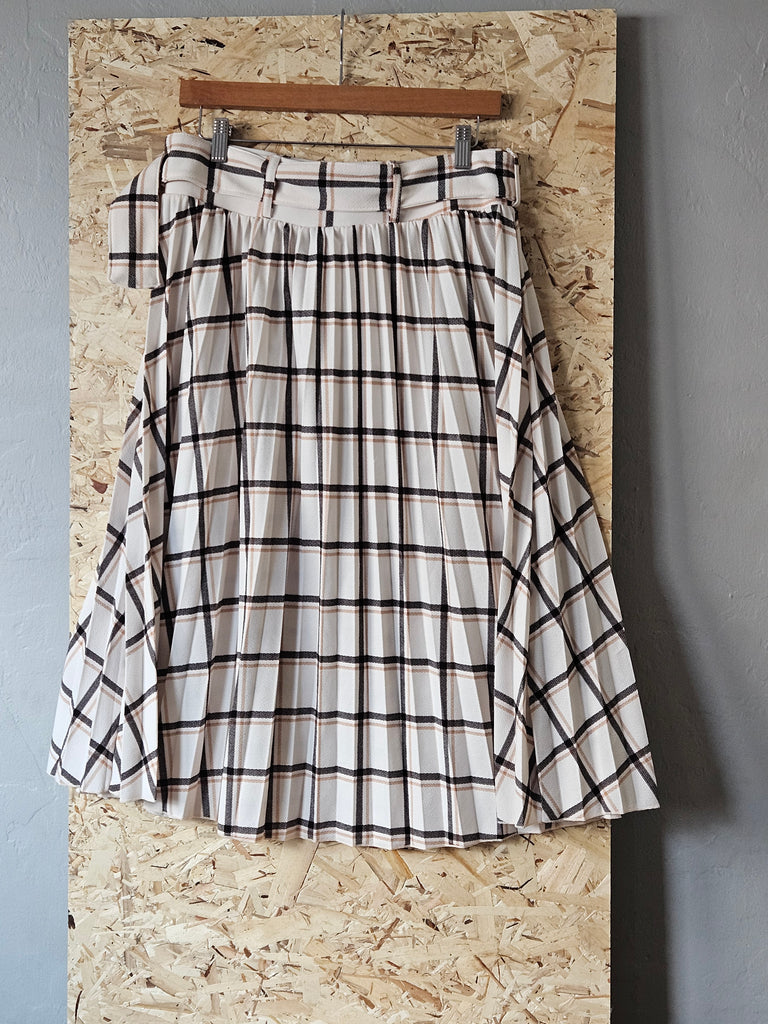 This stylish pleated plaid cream skirt, featuring black and brown - pairs well with a solid top. The included decorative belt adds interest; however, you can always switch out with a look of your own.