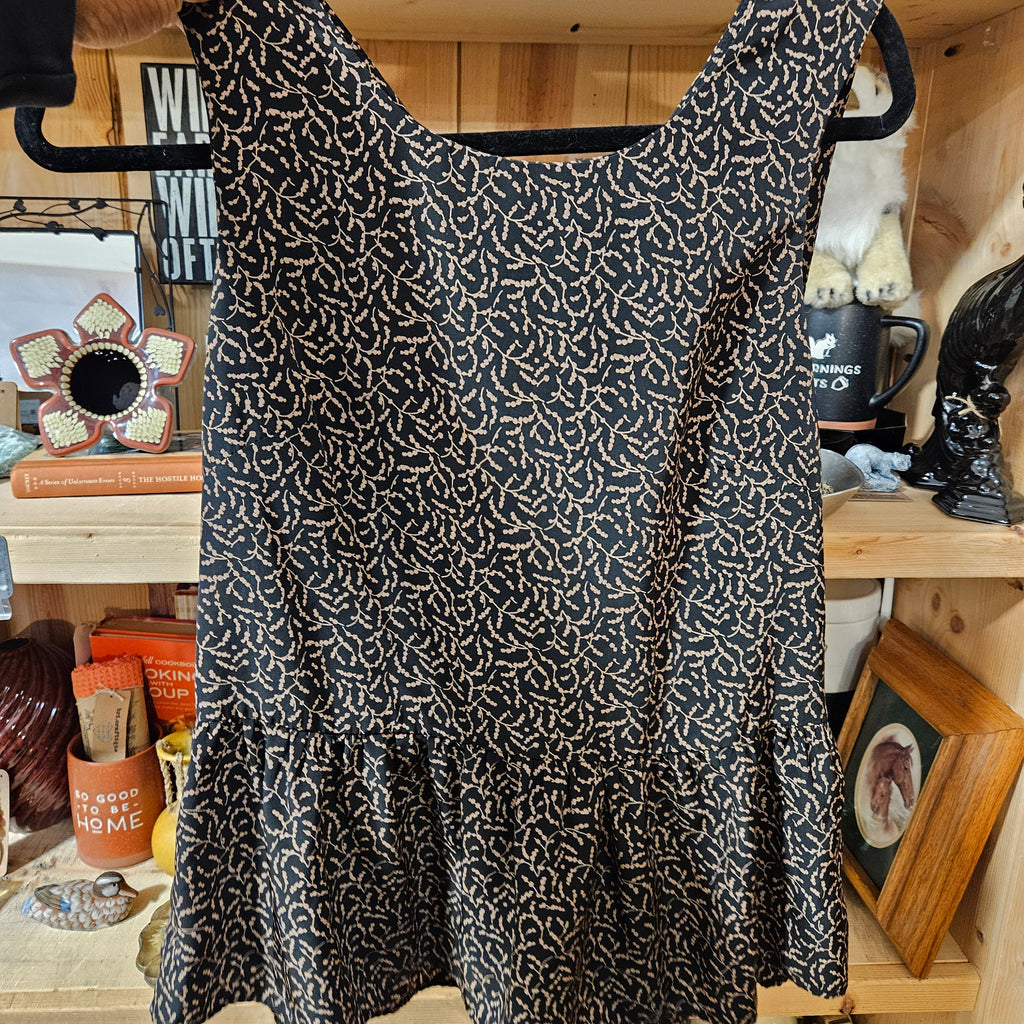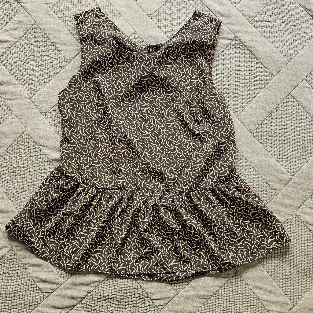 Cute blouse to wear with jeans or black slacks.Featuring brown leaf patterns on a black background, in a peplum cut with the back open.