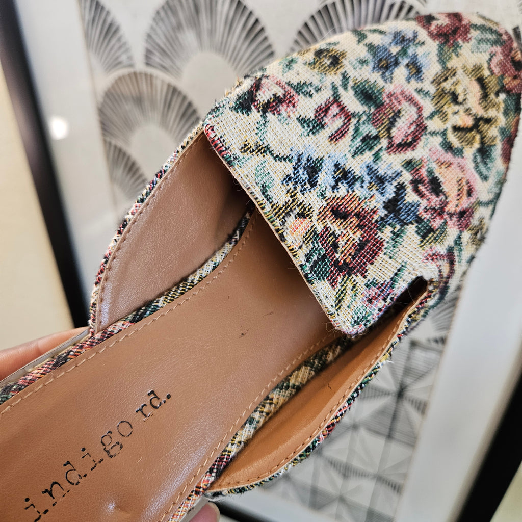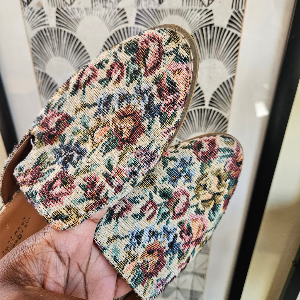 Slide right into these comfy cozy mules, featuring a floral textile detail. Perfect addition to any creative's wardrobe - seeking a handmade or unique look.
