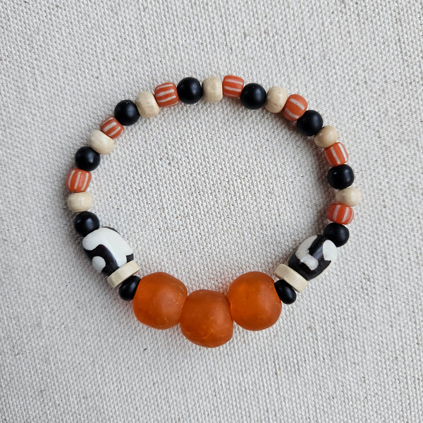 An eclectic mix of batik printed bone, onyx, wood, orange striped beads and orange recycled glass as a focal point - strung on an elastic clear cord.