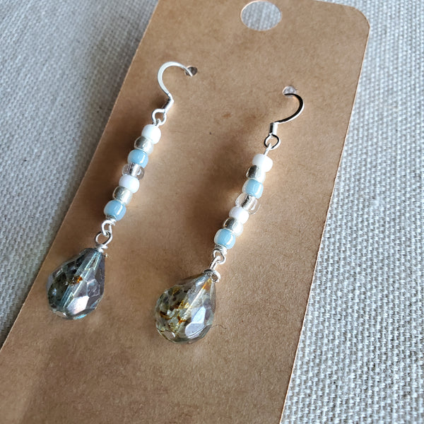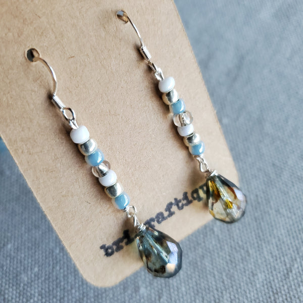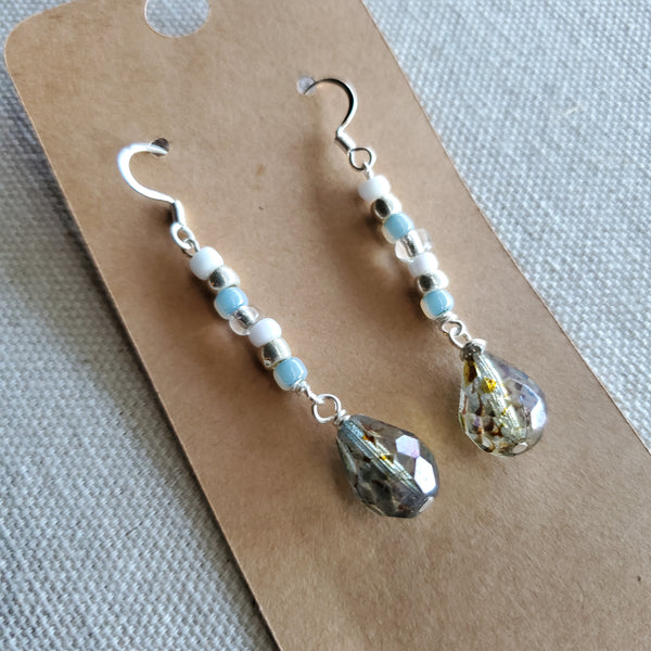 Show off these glimmering dangles, featuring seed beads in blue, white and silver with a faceted teardrop Czech glass crystal. Perfectly pairs with a maxi dress or jeans and a cute top!