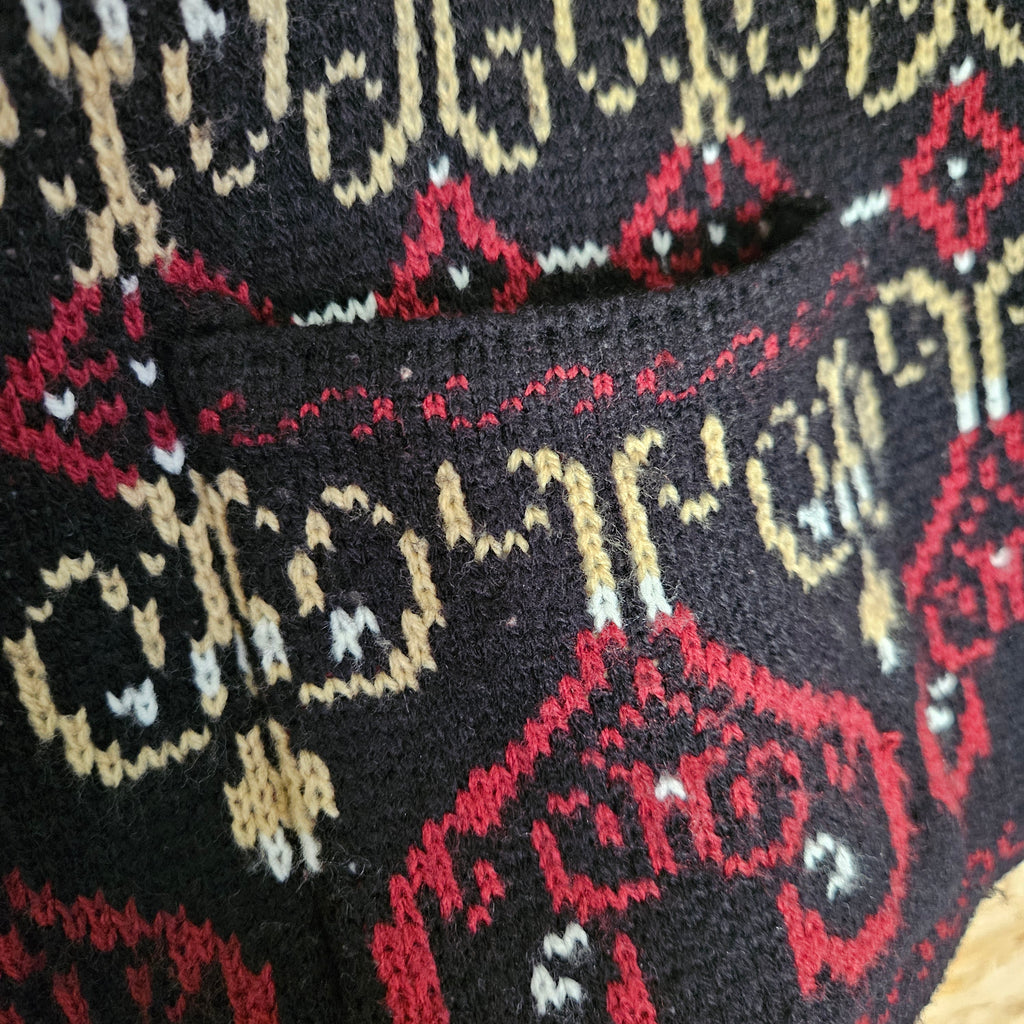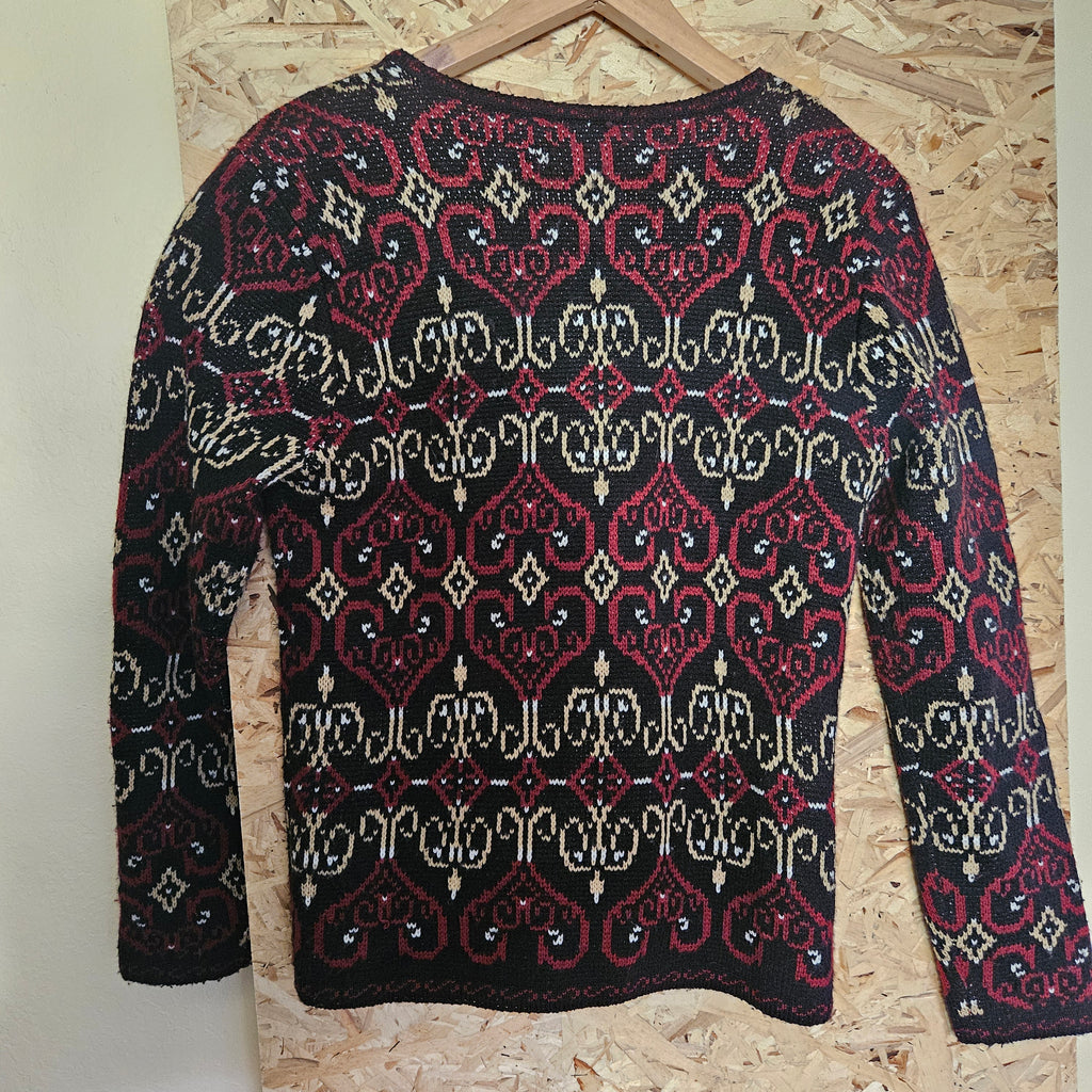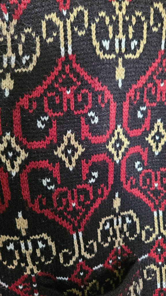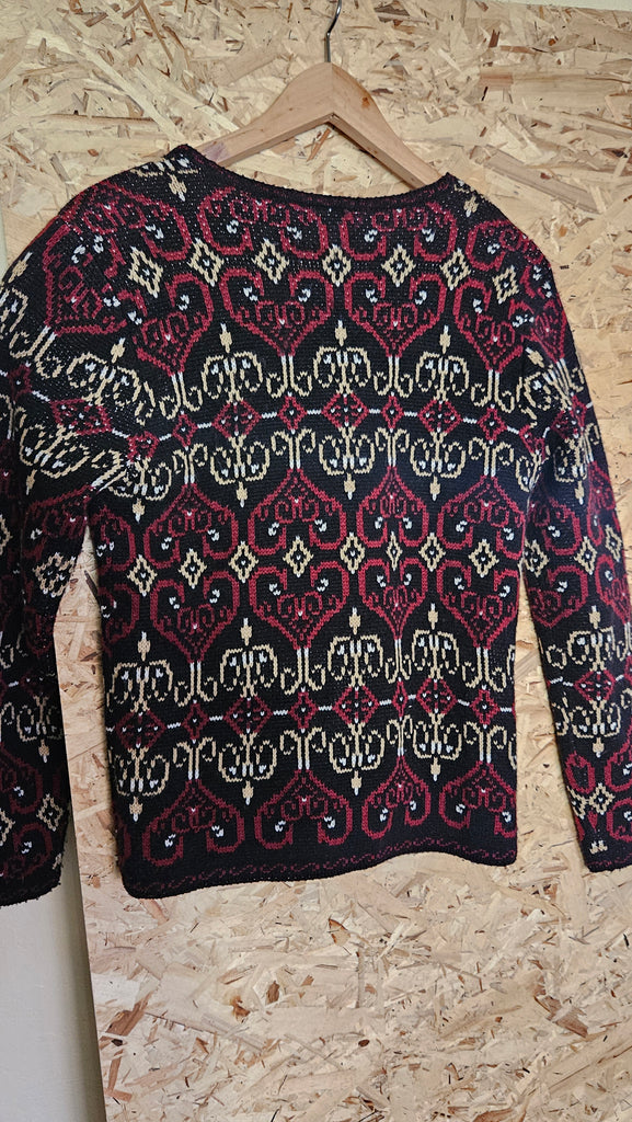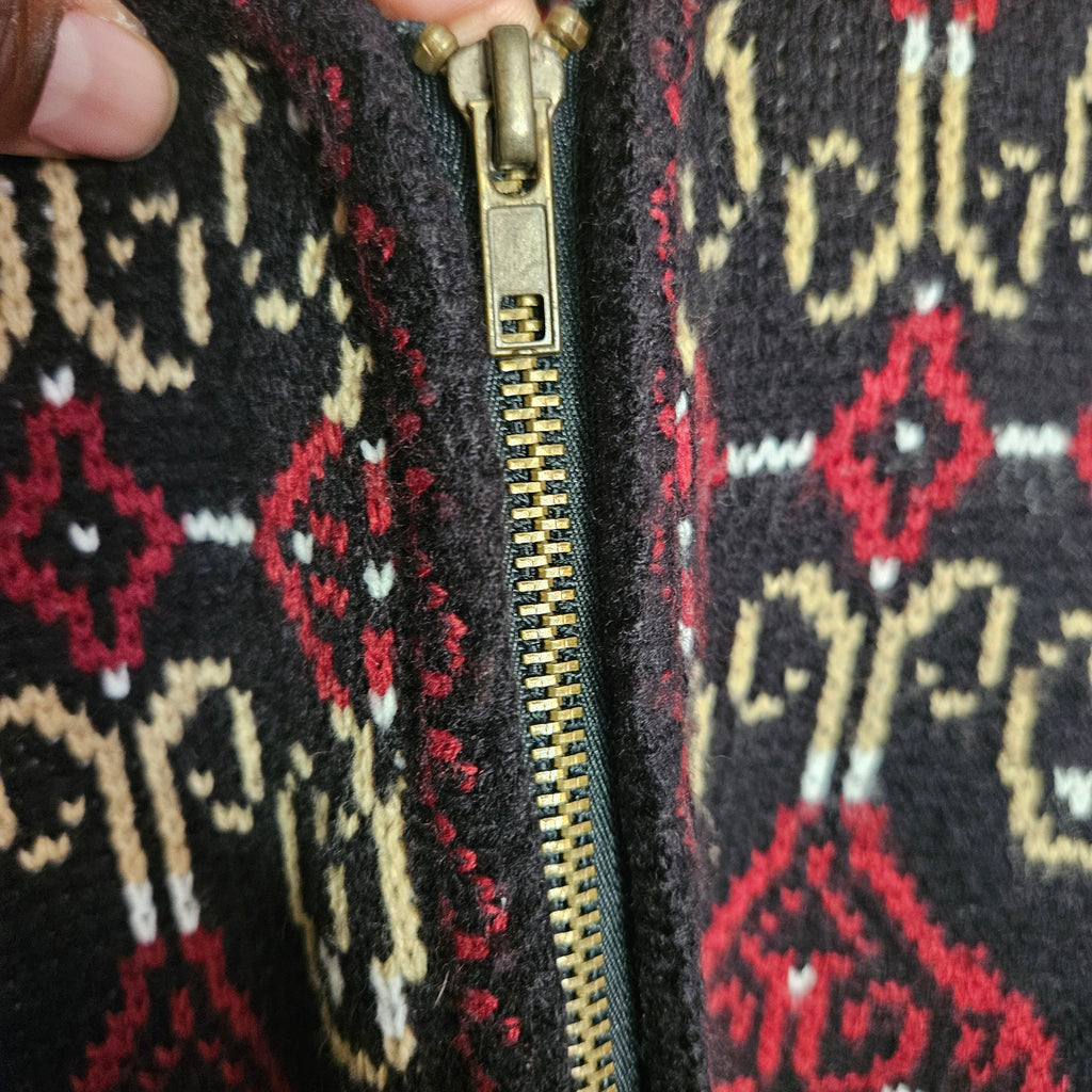 This show-stopping sweater is sure to keep you warm and turn heads. Featuring geometric prints of hearts and swirls and a zipper - this bold sweater is ready to be added to your signature pieces in your closet.