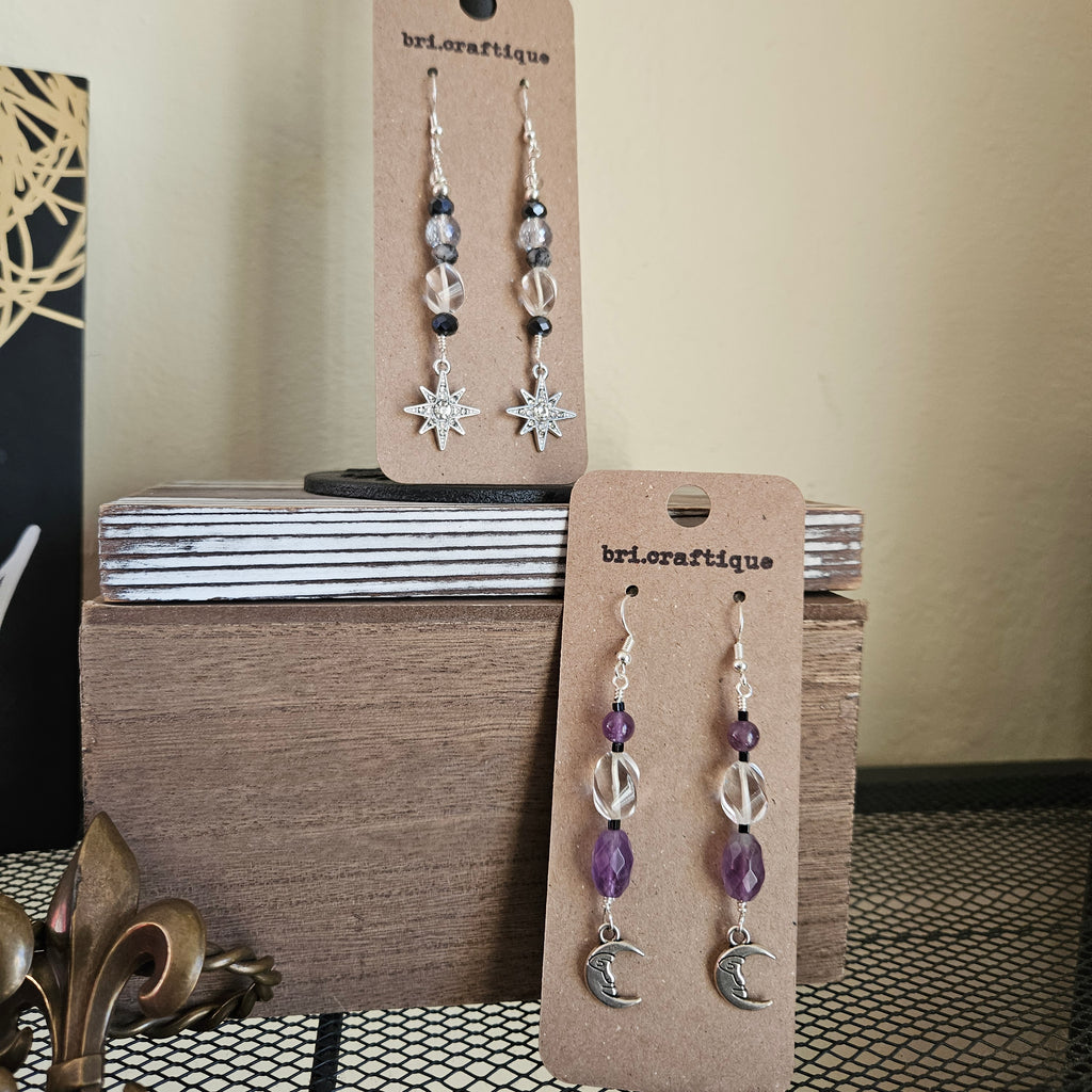 Sparkle and shine with these glimmering dangles, featuring vintage clear crystal bead, tourmalated quartz and deep blue glass faceted crystal - topped off with a rhinestone start charm.